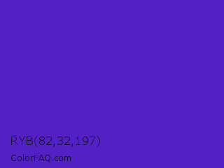RYB 82,32,197 Color is a normal indigo color and the nearest color is Purple Heart Crayola #652dc1. Hex code #5220c5 and RGB value is rgb(82,32,197). In RGB color space, this color is composed of 32% red, 13% green, 77% blue, In CMYK color space, this color is composed of 58% cyan, 84% magenta, 0% yellow , 23% black , In HSL color space, this color has a hue angle of 258° , 72% saturation and 45% lightness.