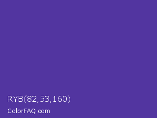 RYB 82,53,160 Color is a normal indigo color and the nearest color is Gigas #523c94. Hex code #5235a0 and RGB value is rgb(82,53,160). In RGB color space, this color is composed of 32% red, 21% green, 63% blue, In CMYK color space, this color is composed of 49% cyan, 67% magenta, 0% yellow , 37% black , In HSL color space, this color has a hue angle of 256° , 50% saturation and 42% lightness.