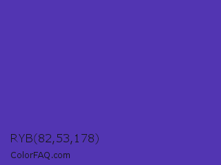 RYB 82,53,178 Color is a normal indigo color and the nearest color is Ocean Blue #4f42b5. Hex code #5235b2 and RGB value is rgb(82,53,178). In RGB color space, this color is composed of 32% red, 21% green, 70% blue, In CMYK color space, this color is composed of 54% cyan, 70% magenta, 0% yellow , 30% black , In HSL color space, this color has a hue angle of 254° , 54% saturation and 45% lightness.