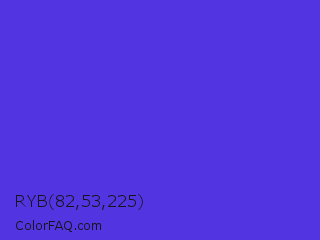 RYB 82,53,225 Color is a normal indigo color and the nearest color is Majorelle Blue #6050dc. Hex code #5235e1 and RGB value is rgb(82,53,225). In RGB color space, this color is composed of 32% red, 21% green, 88% blue, In CMYK color space, this color is composed of 64% cyan, 76% magenta, 0% yellow , 12% black , In HSL color space, this color has a hue angle of 250° , 74% saturation and 55% lightness.