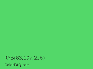 RYB 83,197,216 Color is a normal green color and the nearest color is Emerald #50c878. Hex code #53d869 and RGB value is rgb(83,216,105). In RGB color space, this color is composed of 33% red, 85% green, 41% blue, In CMYK color space, this color is composed of 62% cyan, 0% magenta, 51% yellow , 15% black , In HSL color space, this color has a hue angle of 130° , 63% saturation and 59% lightness.