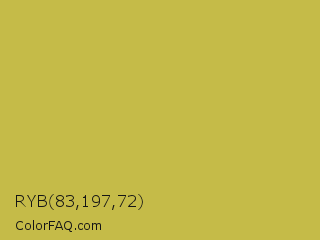 RYB 83,197,72 Color is a normal yellow color and the nearest color is Turmeric #cabb48. Hex code #c5bb48 and RGB value is rgb(197,187,72). In RGB color space, this color is composed of 77% red, 73% green, 28% blue, In CMYK color space, this color is composed of 0% cyan, 5% magenta, 63% yellow , 23% black , In HSL color space, this color has a hue angle of 55° , 52% saturation and 53% lightness.