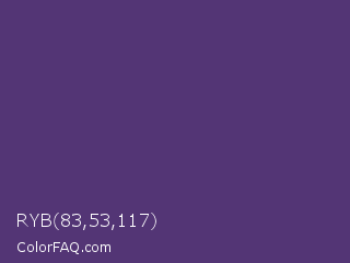 RYB 83,53,117 Color is a normal violet color and the nearest color is Regalia #522d80. Hex code #533575 and RGB value is rgb(83,53,117). In RGB color space, this color is composed of 33% red, 21% green, 46% blue, In CMYK color space, this color is composed of 29% cyan, 55% magenta, 0% yellow , 54% black , In HSL color space, this color has a hue angle of 268° , 38% saturation and 33% lightness.