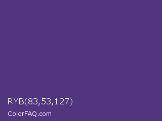 RYB 83,53,127 Color is a normal violet color and the nearest color is Regalia #522d80. Hex code #53357f and RGB value is rgb(83,53,127). In RGB color space, this color is composed of 33% red, 21% green, 50% blue, In CMYK color space, this color is composed of 35% cyan, 58% magenta, 0% yellow , 50% black , In HSL color space, this color has a hue angle of 264° , 41% saturation and 35% lightness.