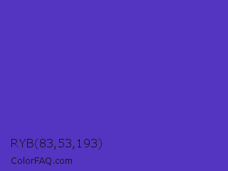 RYB 83,53,193 Color is a normal indigo color and the nearest color is Ocean Blue #4f42b5. Hex code #5335c1 and RGB value is rgb(83,53,193). In RGB color space, this color is composed of 33% red, 21% green, 76% blue, In CMYK color space, this color is composed of 57% cyan, 73% magenta, 0% yellow , 24% black , In HSL color space, this color has a hue angle of 253° , 57% saturation and 48% lightness.