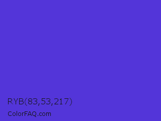 RYB 83,53,217 Color is a normal indigo color and the nearest color is Iris #5a4fcf. Hex code #5335d9 and RGB value is rgb(83,53,217). In RGB color space, this color is composed of 33% red, 21% green, 85% blue, In CMYK color space, this color is composed of 62% cyan, 76% magenta, 0% yellow , 15% black , In HSL color space, this color has a hue angle of 251° , 68% saturation and 53% lightness.