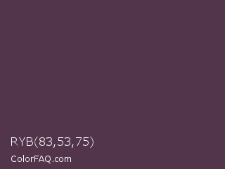 RYB 83,53,75 Color is a dark magenta color and the nearest color is Voodoo #533455. Hex code #53354b and RGB value is rgb(83,53,75). In RGB color space, this color is composed of 33% red, 21% green, 29% blue, In CMYK color space, this color is composed of 0% cyan, 36% magenta, 10% yellow , 67% black , In HSL color space, this color has a hue angle of 316° , 22% saturation and 27% lightness.