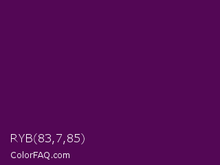 RYB 83,7,85 Color is a very dark magenta color and the nearest color is Clairvoyant #480656. Hex code #530755 and RGB value is rgb(83,7,85). In RGB color space, this color is composed of 33% red, 3% green, 33% blue, In CMYK color space, this color is composed of 2% cyan, 92% magenta, 0% yellow , 67% black , In HSL color space, this color has a hue angle of 298° , 85% saturation and 18% lightness.