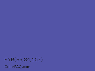 RYB 83,84,167 Color is a normal blue color and the nearest color is Liberty #545aa7. Hex code #5354a7 and RGB value is rgb(83,84,167). In RGB color space, this color is composed of 33% red, 33% green, 65% blue, In CMYK color space, this color is composed of 50% cyan, 50% magenta, 0% yellow , 35% black , In HSL color space, this color has a hue angle of 239° , 34% saturation and 49% lightness.