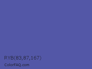 RYB 83,87,167 Color is a normal blue color and the nearest color is Liberty #545aa7. Hex code #5357a7 and RGB value is rgb(83,87,167). In RGB color space, this color is composed of 33% red, 34% green, 65% blue, In CMYK color space, this color is composed of 50% cyan, 48% magenta, 0% yellow , 35% black , In HSL color space, this color has a hue angle of 237° , 34% saturation and 49% lightness.
