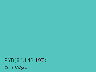 RYB 84,142,197 Color is a normal cyan color and the nearest color is Fountain Blue #56b4be. Hex code #54c5bf and RGB value is rgb(84,197,191). In RGB color space, this color is composed of 33% red, 77% green, 75% blue, In CMYK color space, this color is composed of 57% cyan, 0% magenta, 3% yellow , 23% black , In HSL color space, this color has a hue angle of 177° , 49% saturation and 55% lightness.