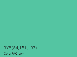 RYB 84,151,197 Color is a normal green color and the nearest color is Ocean Green #48bf91. Hex code #54c5a2 and RGB value is rgb(84,197,162). In RGB color space, this color is composed of 33% red, 77% green, 64% blue, In CMYK color space, this color is composed of 57% cyan, 0% magenta, 18% yellow , 23% black , In HSL color space, this color has a hue angle of 161° , 49% saturation and 55% lightness.