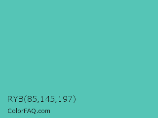 RYB 85,145,197 Color is a normal cyan color and the nearest color is Fountain Blue #56b4be. Hex code #55c5b6 and RGB value is rgb(85,197,182). In RGB color space, this color is composed of 33% red, 77% green, 71% blue, In CMYK color space, this color is composed of 57% cyan, 0% magenta, 8% yellow , 23% black , In HSL color space, this color has a hue angle of 172° , 49% saturation and 55% lightness.