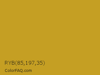 RYB 85,197,35 Color is a normal yellow color and the nearest color is Nugget #c59922. Hex code #c59f23 and RGB value is rgb(197,159,35). In RGB color space, this color is composed of 77% red, 62% green, 14% blue, In CMYK color space, this color is composed of 0% cyan, 19% magenta, 82% yellow , 23% black , In HSL color space, this color has a hue angle of 46° , 70% saturation and 45% lightness.