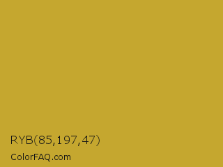 RYB 85,197,47 Color is a normal yellow color and the nearest color is Hokey Pokey #c8a528. Hex code #c5a72f and RGB value is rgb(197,167,47). In RGB color space, this color is composed of 77% red, 65% green, 18% blue, In CMYK color space, this color is composed of 0% cyan, 15% magenta, 76% yellow , 23% black , In HSL color space, this color has a hue angle of 48° , 61% saturation and 48% lightness.