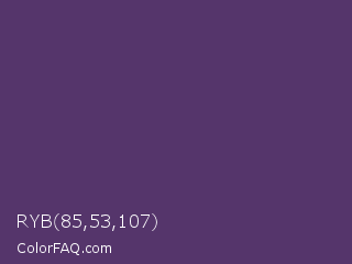 RYB 85,53,107 Color is a normal purple color and the nearest color is Imperial #602f6b. Hex code #55356b and RGB value is rgb(85,53,107). In RGB color space, this color is composed of 33% red, 21% green, 42% blue, In CMYK color space, this color is composed of 21% cyan, 50% magenta, 0% yellow , 58% black , In HSL color space, this color has a hue angle of 276° , 34% saturation and 31% lightness.