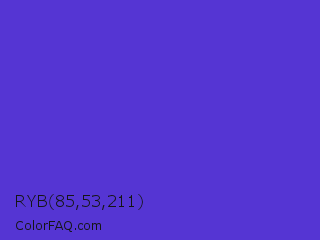 RYB 85,53,211 Color is a normal indigo color and the nearest color is Purple Heart Crayola #652dc1. Hex code #5535d3 and RGB value is rgb(85,53,211). In RGB color space, this color is composed of 33% red, 21% green, 83% blue, In CMYK color space, this color is composed of 60% cyan, 75% magenta, 0% yellow , 17% black , In HSL color space, this color has a hue angle of 252° , 64% saturation and 52% lightness.
