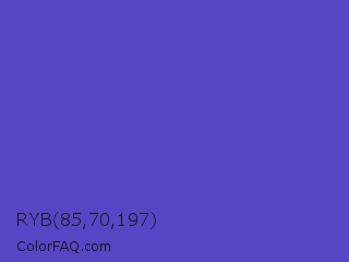 RYB 85,70,197 Color is a normal indigo color and the nearest color is Iris #5a4fcf. Hex code #5546c5 and RGB value is rgb(85,70,197). In RGB color space, this color is composed of 33% red, 27% green, 77% blue, In CMYK color space, this color is composed of 57% cyan, 64% magenta, 0% yellow , 23% black , In HSL color space, this color has a hue angle of 247° , 52% saturation and 52% lightness.