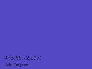 RYB 85,72,197 Color is a normal indigo color and the nearest color is Iris #5a4fcf. Hex code #5548c5 and RGB value is rgb(85,72,197). In RGB color space, this color is composed of 33% red, 28% green, 77% blue, In CMYK color space, this color is composed of 57% cyan, 63% magenta, 0% yellow , 23% black , In HSL color space, this color has a hue angle of 246° , 52% saturation and 53% lightness.