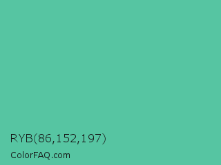 RYB 86,152,197 Color is a normal green color and the nearest color is Tradewind #5fb3ac. Hex code #56c5a2 and RGB value is rgb(86,197,162). In RGB color space, this color is composed of 34% red, 77% green, 64% blue, In CMYK color space, this color is composed of 56% cyan, 0% magenta, 18% yellow , 23% black , In HSL color space, this color has a hue angle of 161° , 49% saturation and 55% lightness.