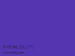 RYB 86,53,177 Color is a normal indigo color and the nearest color is Ocean Blue #4f42b5. Hex code #5635b1 and RGB value is rgb(86,53,177). In RGB color space, this color is composed of 34% red, 21% green, 69% blue, In CMYK color space, this color is composed of 51% cyan, 70% magenta, 0% yellow , 31% black , In HSL color space, this color has a hue angle of 256° , 54% saturation and 45% lightness.