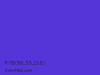 RYB 86,53,216 Color is a normal indigo color and the nearest color is Iris #5a4fcf. Hex code #5635d8 and RGB value is rgb(86,53,216). In RGB color space, this color is composed of 34% red, 21% green, 85% blue, In CMYK color space, this color is composed of 60% cyan, 75% magenta, 0% yellow , 15% black , In HSL color space, this color has a hue angle of 252° , 68% saturation and 53% lightness.