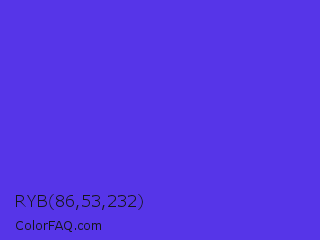 RYB 86,53,232 Color is a normal indigo color and the nearest color is Majorelle Blue #6050dc. Hex code #5635e8 and RGB value is rgb(86,53,232). In RGB color space, this color is composed of 34% red, 21% green, 91% blue, In CMYK color space, this color is composed of 63% cyan, 77% magenta, 0% yellow , 9% black , In HSL color space, this color has a hue angle of 251° , 80% saturation and 56% lightness.