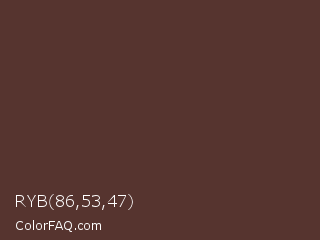RYB 86,53,47 Color is a dark red color and the nearest color is Congo Brown #593737. Hex code #56342f and RGB value is rgb(86,52,47). In RGB color space, this color is composed of 34% red, 20% green, 18% blue, In CMYK color space, this color is composed of 0% cyan, 40% magenta, 45% yellow , 66% black , In HSL color space, this color has a hue angle of 8° , 29% saturation and 26% lightness.
