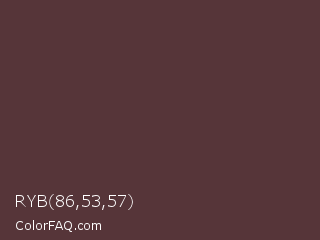 RYB 86,53,57 Color is a dark red color and the nearest color is Congo Brown #593737. Hex code #563539 and RGB value is rgb(86,53,57). In RGB color space, this color is composed of 34% red, 21% green, 22% blue, In CMYK color space, this color is composed of 0% cyan, 38% magenta, 34% yellow , 66% black , In HSL color space, this color has a hue angle of 353° , 24% saturation and 27% lightness.