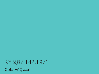 RYB 87,142,197 Color is a normal cyan color and the nearest color is Sea Serpent #4bc7cf. Hex code #57c5c5 and RGB value is rgb(87,197,197). In RGB color space, this color is composed of 34% red, 77% green, 77% blue, In CMYK color space, this color is composed of 56% cyan, 0% magenta, 0% yellow , 23% black , In HSL color space, this color has a hue angle of 180° , 49% saturation and 56% lightness.