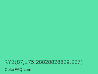 RYB 87,175.28828828829,227 Color is a light green color and the nearest color is Medium Aquamarine #66ddaa. Hex code #57e3a9 and RGB value is rgb(87,227,169). In RGB color space, this color is composed of 34% red, 89% green, 66% blue, In CMYK color space, this color is composed of 62% cyan, 0% magenta, 26% yellow , 11% black , In HSL color space, this color has a hue angle of 155° , 71% saturation and 62% lightness.