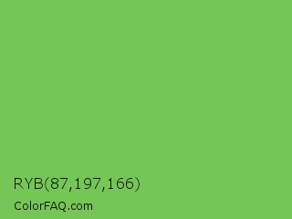 RYB 87,197,166 Color is a normal green color and the nearest color is Mantis #74c365. Hex code #76c557 and RGB value is rgb(118,197,87). In RGB color space, this color is composed of 46% red, 77% green, 34% blue, In CMYK color space, this color is composed of 40% cyan, 0% magenta, 56% yellow , 23% black , In HSL color space, this color has a hue angle of 103° , 49% saturation and 56% lightness.