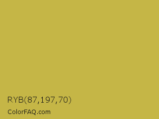 RYB 87,197,70 Color is a normal yellow color and the nearest color is Turmeric #cabb48. Hex code #c5b646 and RGB value is rgb(197,182,70). In RGB color space, this color is composed of 77% red, 71% green, 27% blue, In CMYK color space, this color is composed of 0% cyan, 8% magenta, 64% yellow , 23% black , In HSL color space, this color has a hue angle of 53° , 52% saturation and 52% lightness.