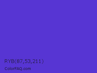 RYB 87,53,211 Color is a normal indigo color and the nearest color is Purple Heart Crayola #652dc1. Hex code #5735d3 and RGB value is rgb(87,53,211). In RGB color space, this color is composed of 34% red, 21% green, 83% blue, In CMYK color space, this color is composed of 59% cyan, 75% magenta, 0% yellow , 17% black , In HSL color space, this color has a hue angle of 253° , 64% saturation and 52% lightness.