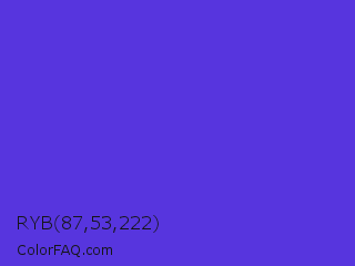 RYB 87,53,222 Color is a normal indigo color and the nearest color is Majorelle Blue #6050dc. Hex code #5735de and RGB value is rgb(87,53,222). In RGB color space, this color is composed of 34% red, 21% green, 87% blue, In CMYK color space, this color is composed of 61% cyan, 76% magenta, 0% yellow , 13% black , In HSL color space, this color has a hue angle of 252° , 72% saturation and 54% lightness.