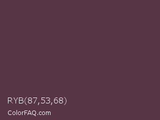 RYB 87,53,68 Color is a dark rose color and the nearest color is Matterhorn #4e3b41. Hex code #573544 and RGB value is rgb(87,53,68). In RGB color space, this color is composed of 34% red, 21% green, 27% blue, In CMYK color space, this color is composed of 0% cyan, 39% magenta, 22% yellow , 66% black , In HSL color space, this color has a hue angle of 334° , 24% saturation and 27% lightness.