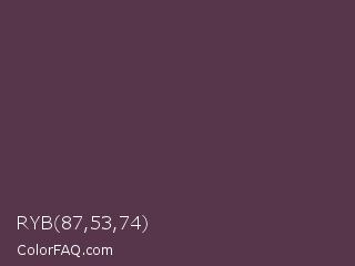 RYB 87,53,74 Color is a dark magenta color and the nearest color is Voodoo #533455. Hex code #57354a and RGB value is rgb(87,53,74). In RGB color space, this color is composed of 34% red, 21% green, 29% blue, In CMYK color space, this color is composed of 0% cyan, 39% magenta, 15% yellow , 66% black , In HSL color space, this color has a hue angle of 323° , 24% saturation and 27% lightness.