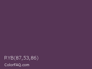 RYB 87,53,86 Color is a dark magenta color and the nearest color is Voodoo #533455. Hex code #573556 and RGB value is rgb(87,53,86). In RGB color space, this color is composed of 34% red, 21% green, 34% blue, In CMYK color space, this color is composed of 0% cyan, 39% magenta, 1% yellow , 66% black , In HSL color space, this color has a hue angle of 302° , 24% saturation and 27% lightness.