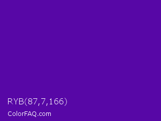 RYB 87,7,166 Color is a normal violet color and the nearest color is Purple #660099. Hex code #5707a6 and RGB value is rgb(87,7,166). In RGB color space, this color is composed of 34% red, 3% green, 65% blue, In CMYK color space, this color is composed of 48% cyan, 96% magenta, 0% yellow , 35% black , In HSL color space, this color has a hue angle of 270° , 92% saturation and 34% lightness.