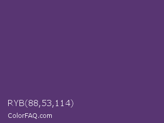 RYB 88,53,114 Color is a normal purple color and the nearest color is Imperial #602f6b. Hex code #583572 and RGB value is rgb(88,53,114). In RGB color space, this color is composed of 35% red, 21% green, 45% blue, In CMYK color space, this color is composed of 23% cyan, 54% magenta, 0% yellow , 55% black , In HSL color space, this color has a hue angle of 274° , 37% saturation and 33% lightness.