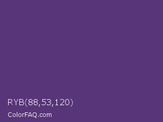 RYB 88,53,120 Color is a normal purple color and the nearest color is Regalia #522d80. Hex code #583578 and RGB value is rgb(88,53,120). In RGB color space, this color is composed of 35% red, 21% green, 47% blue, In CMYK color space, this color is composed of 27% cyan, 56% magenta, 0% yellow , 53% black , In HSL color space, this color has a hue angle of 271° , 39% saturation and 34% lightness.