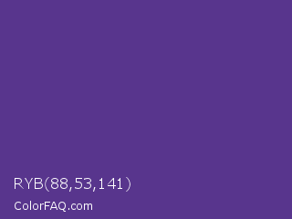 RYB 88,53,141 Color is a normal violet color and the nearest color is Blue Magenta Violet #553592. Hex code #58358d and RGB value is rgb(88,53,141). In RGB color space, this color is composed of 35% red, 21% green, 55% blue, In CMYK color space, this color is composed of 38% cyan, 62% magenta, 0% yellow , 45% black , In HSL color space, this color has a hue angle of 264° , 45% saturation and 38% lightness.