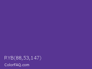 RYB 88,53,147 Color is a normal violet color and the nearest color is Blue Magenta Violet #553592. Hex code #583593 and RGB value is rgb(88,53,147). In RGB color space, this color is composed of 35% red, 21% green, 58% blue, In CMYK color space, this color is composed of 40% cyan, 64% magenta, 0% yellow , 42% black , In HSL color space, this color has a hue angle of 262° , 47% saturation and 39% lightness.