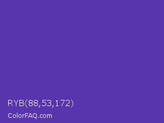 RYB 88,53,172 Color is a normal indigo color and the nearest color is Plump Purple #5946b2. Hex code #5835ac and RGB value is rgb(88,53,172). In RGB color space, this color is composed of 35% red, 21% green, 67% blue, In CMYK color space, this color is composed of 49% cyan, 69% magenta, 0% yellow , 33% black , In HSL color space, this color has a hue angle of 258° , 53% saturation and 44% lightness.