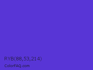 RYB 88,53,214 Color is a normal indigo color and the nearest color is Purple Heart Crayola #652dc1. Hex code #5835d6 and RGB value is rgb(88,53,214). In RGB color space, this color is composed of 35% red, 21% green, 84% blue, In CMYK color space, this color is composed of 59% cyan, 75% magenta, 0% yellow , 16% black , In HSL color space, this color has a hue angle of 253° , 66% saturation and 52% lightness.