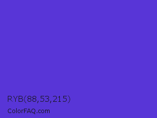 RYB 88,53,215 Color is a normal indigo color and the nearest color is Purple Heart Crayola #652dc1. Hex code #5835d7 and RGB value is rgb(88,53,215). In RGB color space, this color is composed of 35% red, 21% green, 84% blue, In CMYK color space, this color is composed of 59% cyan, 75% magenta, 0% yellow , 16% black , In HSL color space, this color has a hue angle of 253° , 67% saturation and 53% lightness.