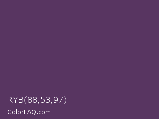 RYB 88,53,97 Color is a dark purple color and the nearest color is English Violet #563c5c. Hex code #583561 and RGB value is rgb(88,53,97). In RGB color space, this color is composed of 35% red, 21% green, 38% blue, In CMYK color space, this color is composed of 9% cyan, 45% magenta, 0% yellow , 62% black , In HSL color space, this color has a hue angle of 288° , 29% saturation and 29% lightness.