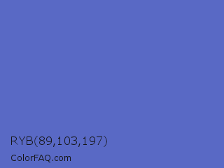 RYB 89,103,197 Color is a normal blue color and the nearest color is Indigo #4f69c6. Hex code #5969c5 and RGB value is rgb(89,105,197). In RGB color space, this color is composed of 35% red, 41% green, 77% blue, In CMYK color space, this color is composed of 55% cyan, 47% magenta, 0% yellow , 23% black , In HSL color space, this color has a hue angle of 231° , 48% saturation and 56% lightness.
