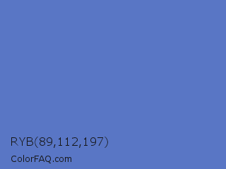 RYB 89,112,197 Color is a normal blue color and the nearest color is Indigo #4f69c6. Hex code #5976c5 and RGB value is rgb(89,118,197). In RGB color space, this color is composed of 35% red, 46% green, 77% blue, In CMYK color space, this color is composed of 55% cyan, 40% magenta, 0% yellow , 23% black , In HSL color space, this color has a hue angle of 224° , 48% saturation and 56% lightness.
