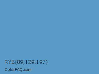 RYB 89,129,197 Color is a normal blue color and the nearest color is Blue Gray #6699cc. Hex code #5999c5 and RGB value is rgb(89,153,197). In RGB color space, this color is composed of 35% red, 60% green, 77% blue, In CMYK color space, this color is composed of 55% cyan, 22% magenta, 0% yellow , 23% black , In HSL color space, this color has a hue angle of 204° , 48% saturation and 56% lightness.